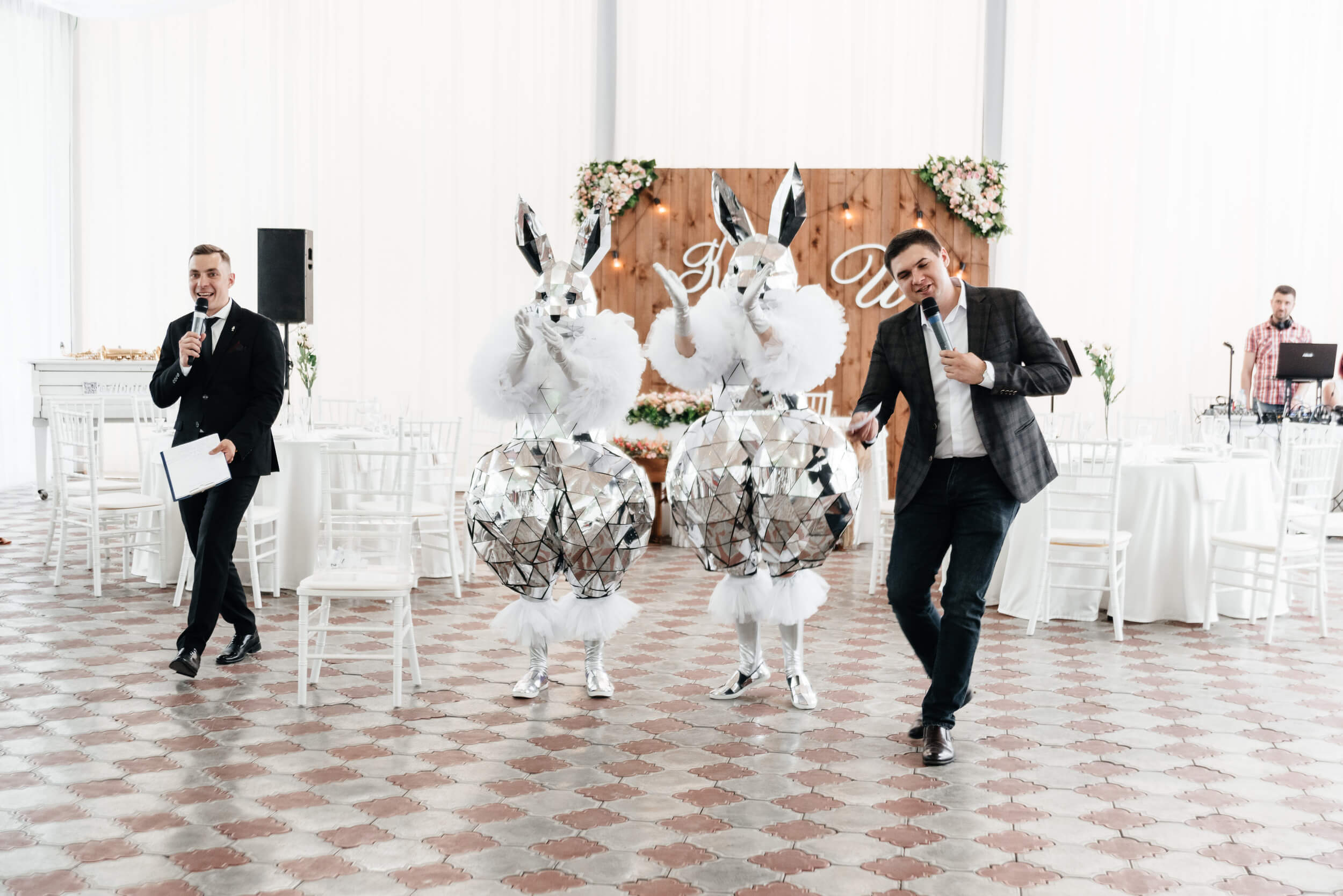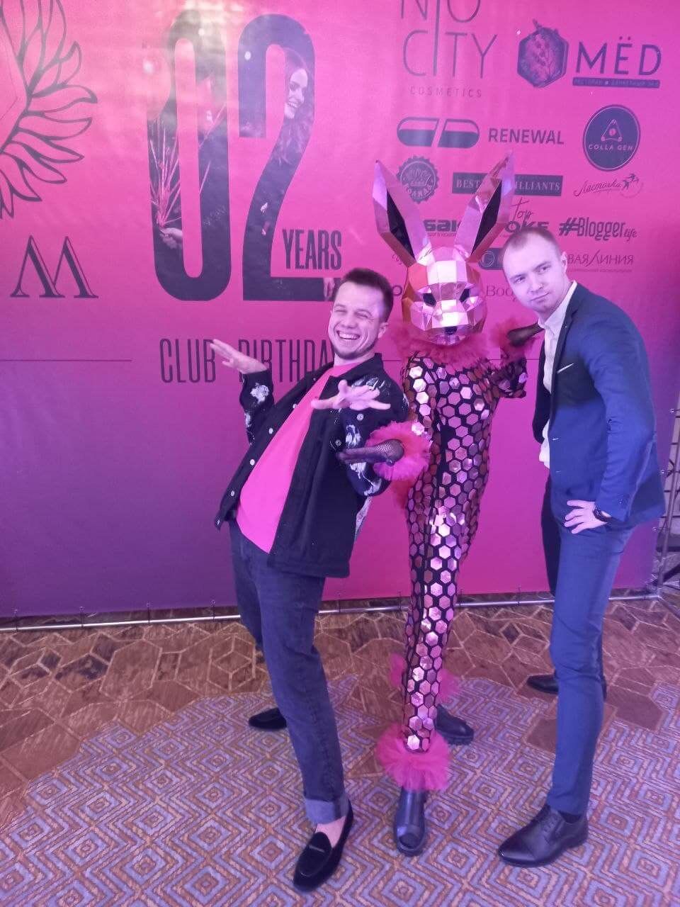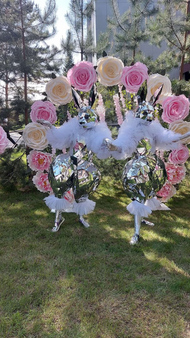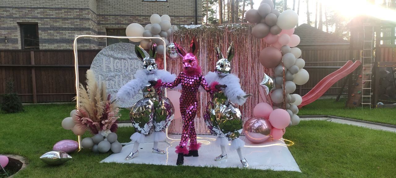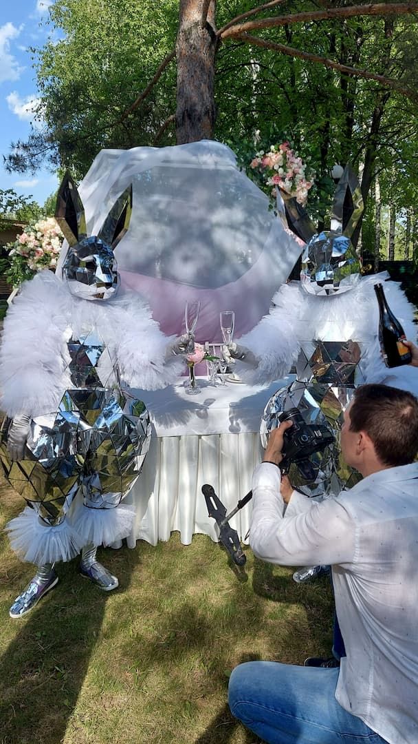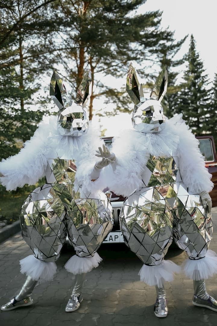 Два зеркальных зайца, один с розовыми рукавами, другой с голубыми, проведут сбор денег на девочку или мальчика. Станцуют победный танец. Будут живой фотозоной для вас и ваших гостей.